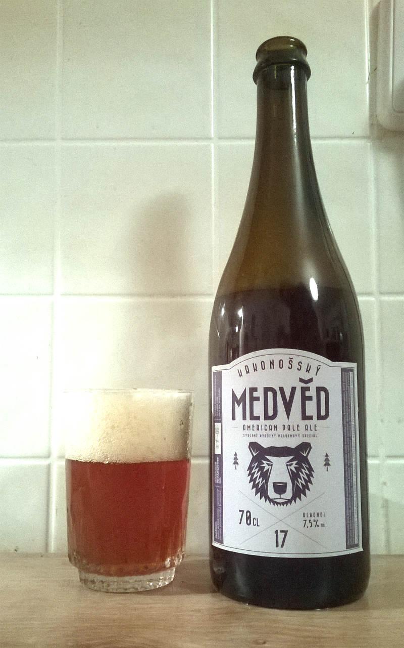 Krkonošský Medvěd – American pale ale o 17% EPM je pivo svou silou už poněkud vyčnívající ze stylu APA. Jde o ejl vyšší barvy, připomínající rudnoucí jantar, „nečiré“ s viditelnou trochou kvasnic.