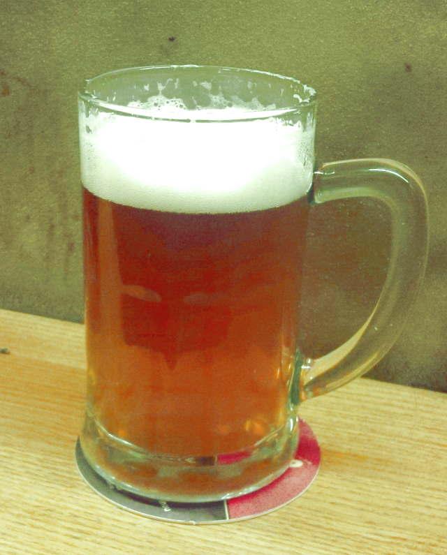 Obrázek je vyfocen za špatného světla, takže není jasná barva piva; navíc půllitr není uprostřed.